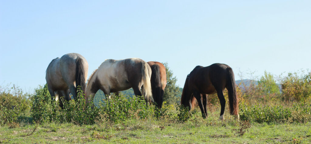 Pension : en troupeau de 3 ou 4 chevaux, dans de grands parcs, avec abris en bois et abris naturels et du foin à volonté. Accès aux infrastructures, départ de nombreux chemins de balade et possibilité de prendre des cours sur place