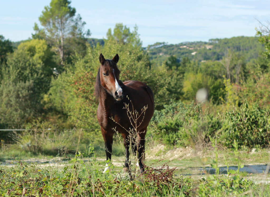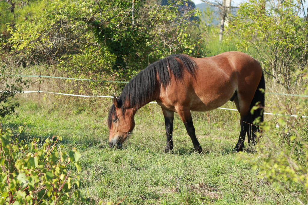 « Je suis le plus jeune de l’écurie ! Mais aussi le plus grand. Quand je suis arrivée, je ne connaissais pas trop l’homme car je vivais en troupeau dans la montagne, en semi-liberté. Mais aujourd’hui, je recherche le contact, je suis même le premier à demander des gratouilles quand un humain passe à côté de mon parc !