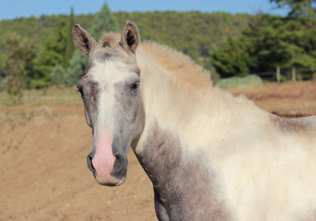 Mon petit truc en plus : Ma robe, pie rouan et mon petit nez rose ! Je me gratte aussi, ce qui fait que je n’ai pas beaucoup de crinière et de toupet mais ça me donne du charme »